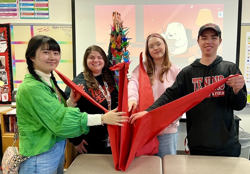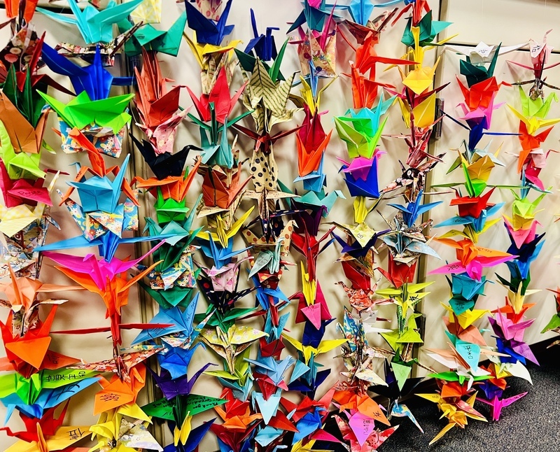 A peace study was done in Mrs. Olfson’s class and the Japanese class. A special speaker, an international student from Japan, was invited to share about Hiroshima . Today they made cranes. The crane is symbol of peace and hope. Students wrote their name and a message on origami cranes. We will ship these to Hiroshima Peace Memorial Park.